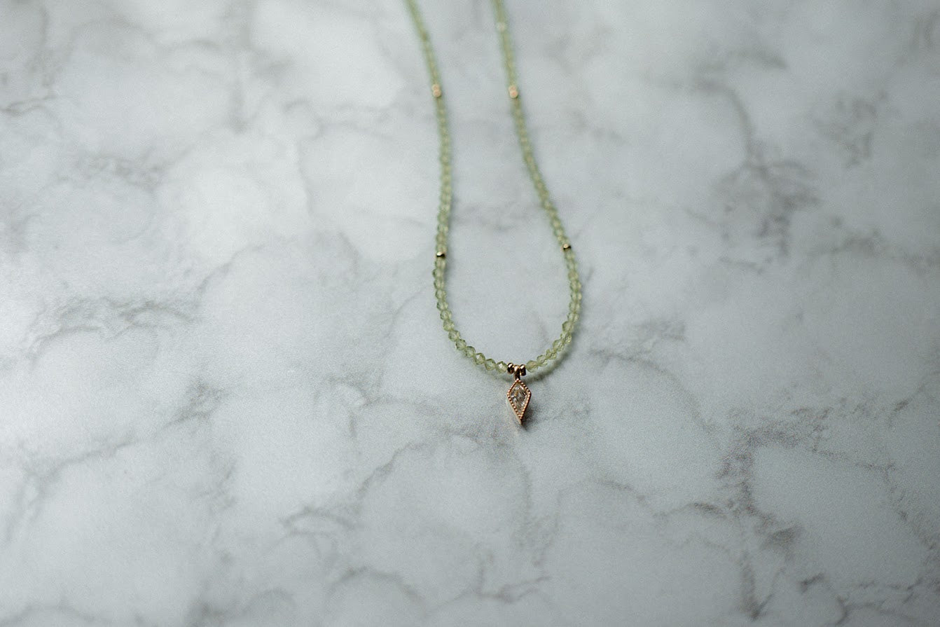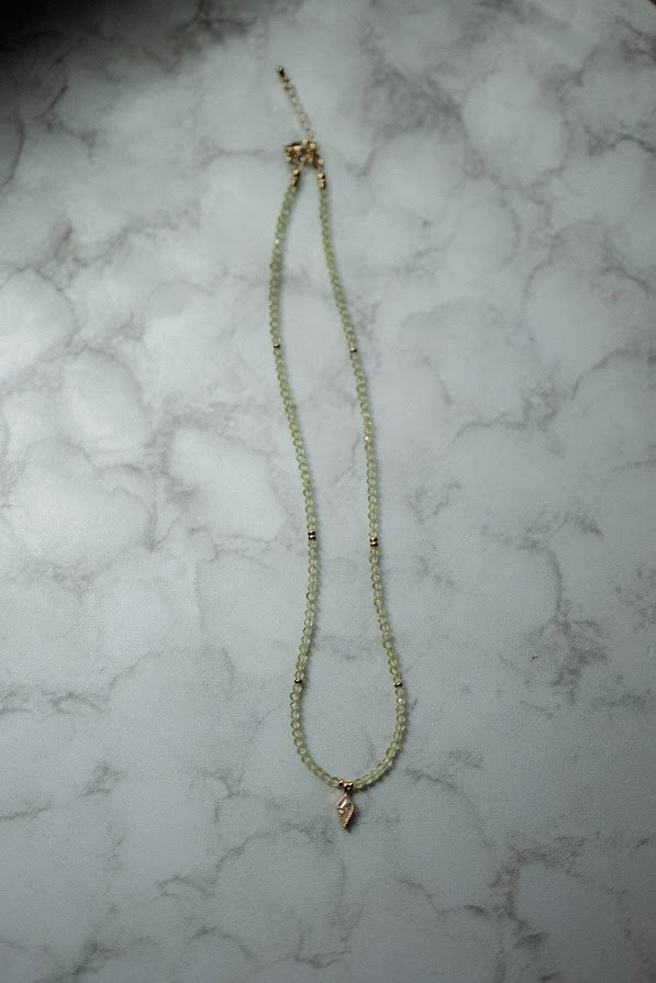 Materials: Peridot gemstone with gold filled pendant charm, gold filled spacers, gold filled lobster clasp and gold filled extender chain.