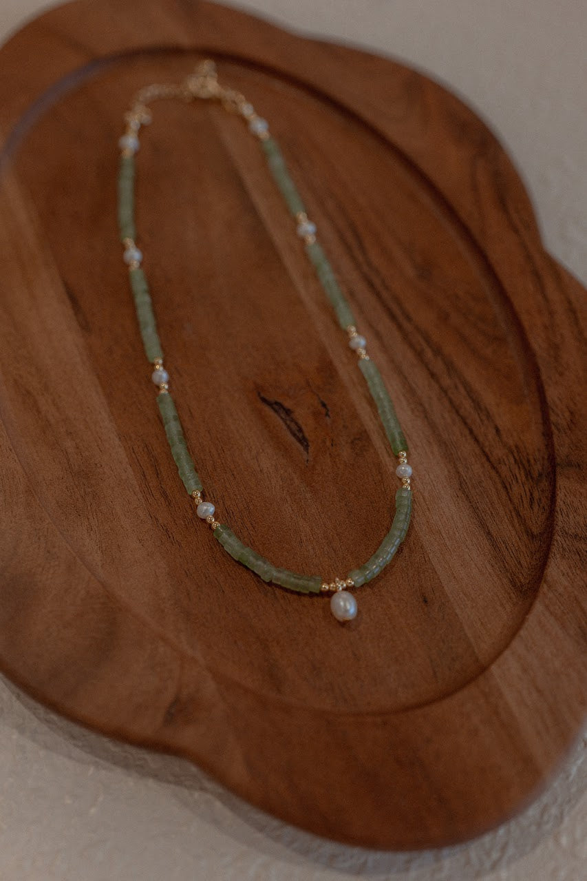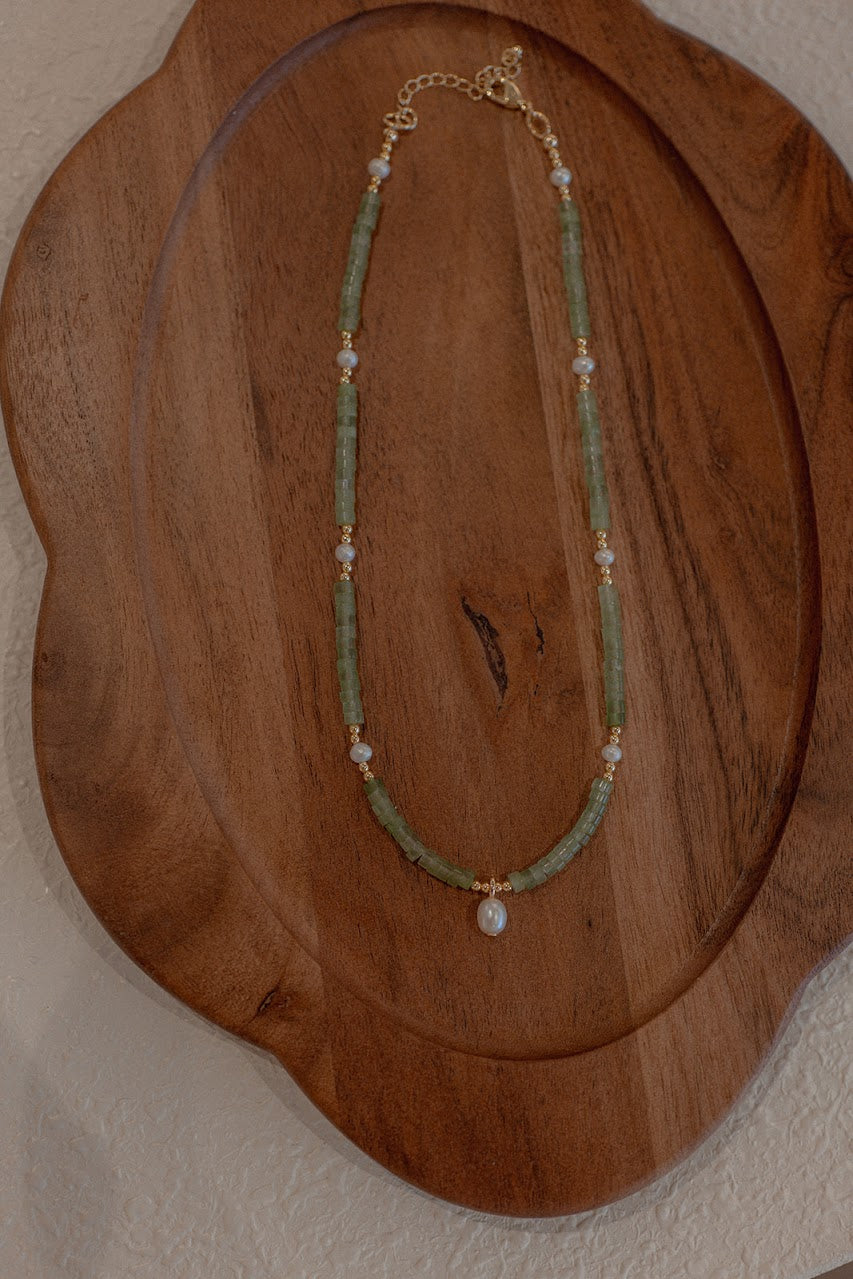 Materials: Green Aventurine Heishi Gemstone Beads with Freshwater Pearls and Gold Filled Pearl Charm.