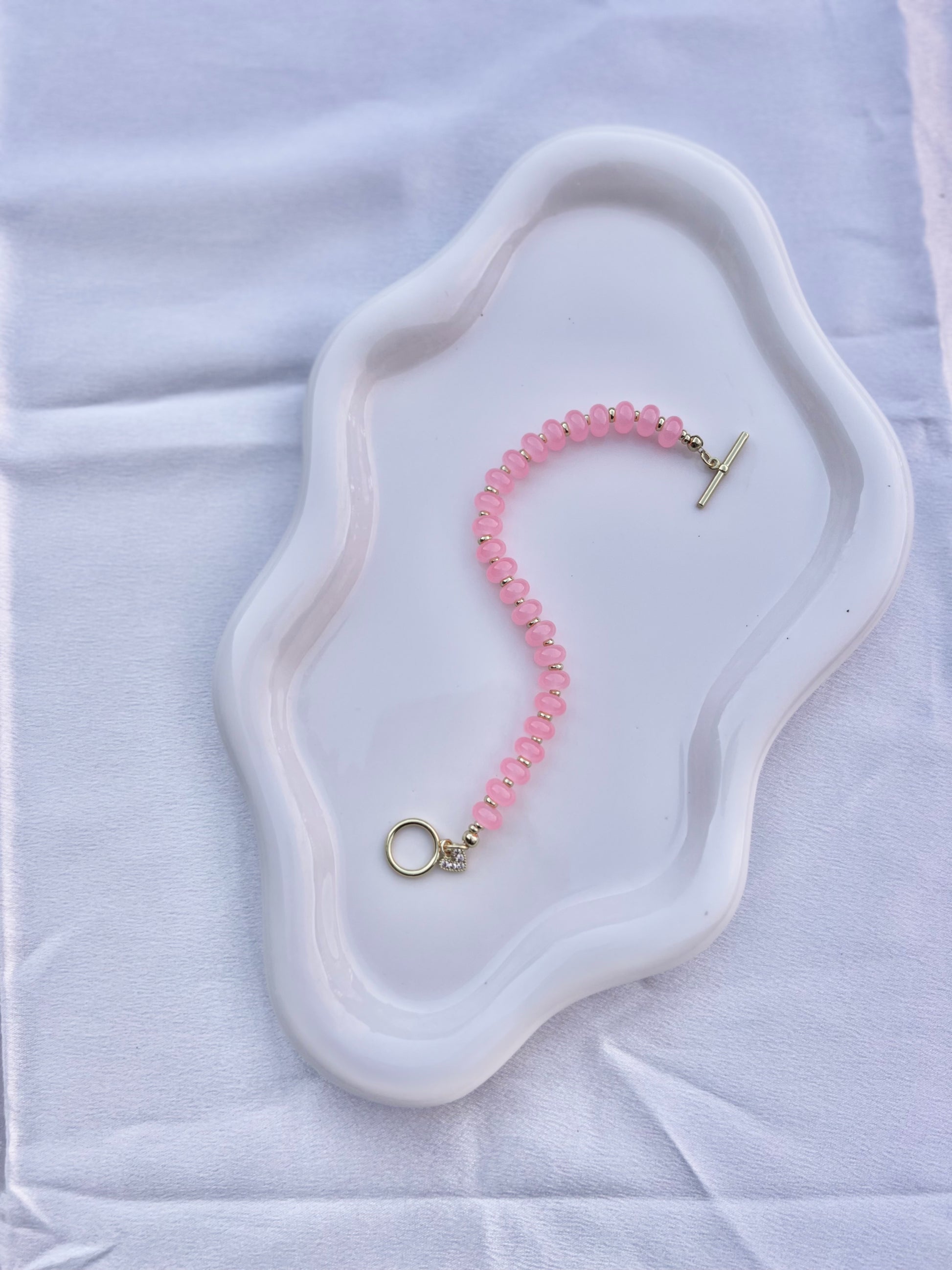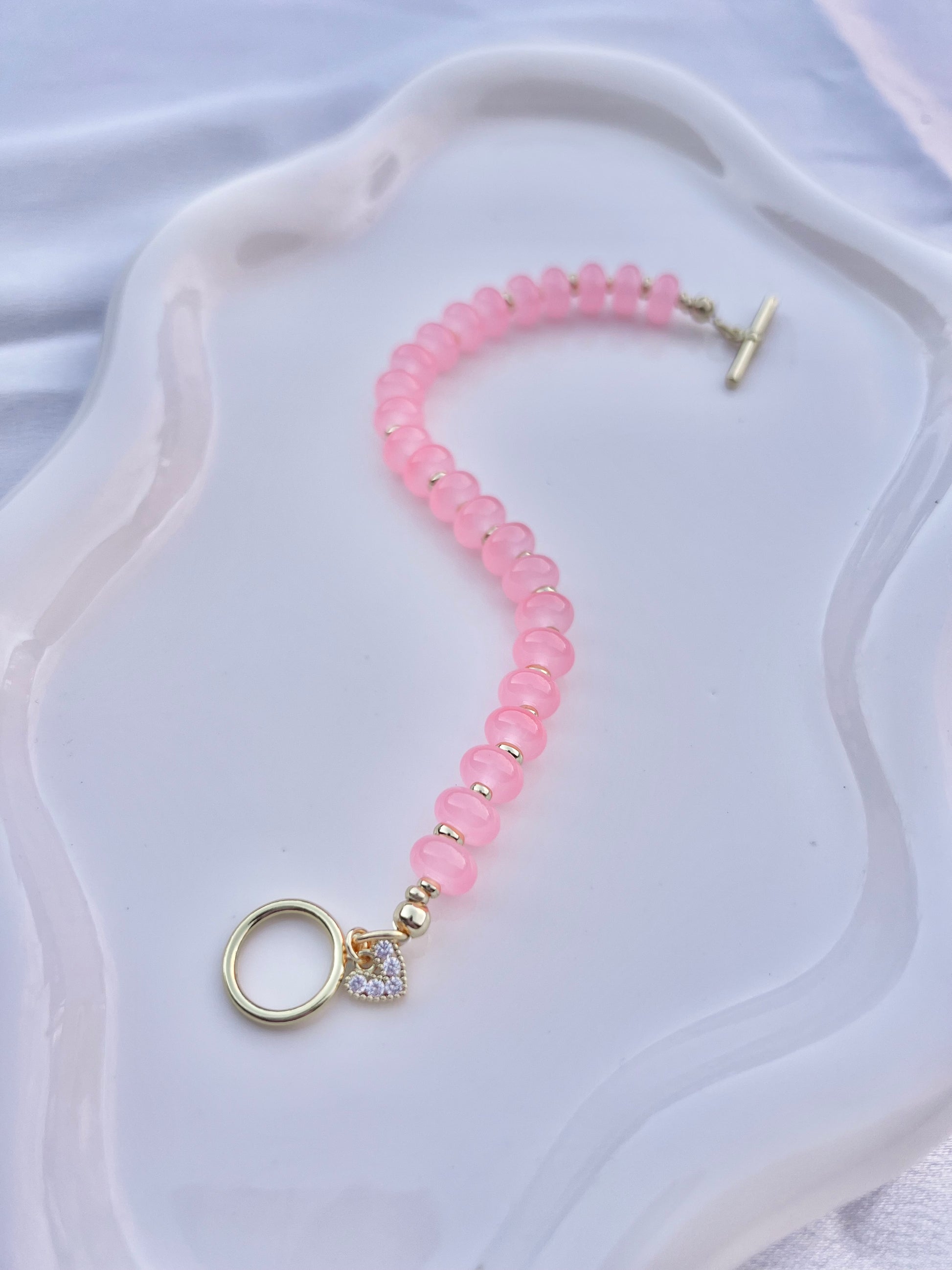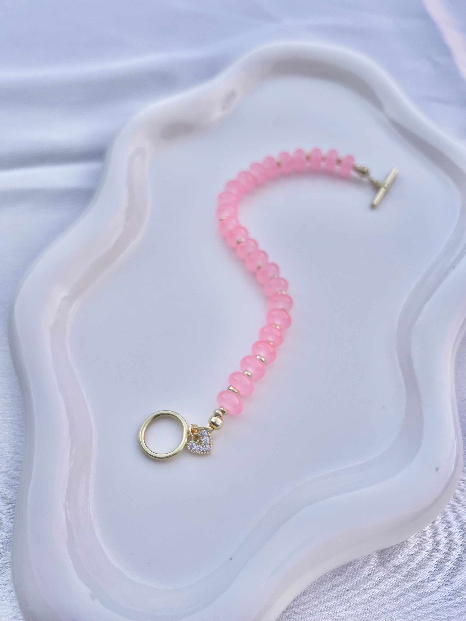 Materials: Pink Dyed Jade with gold filled spacers, gold filled heart charm and gold filled toggle.