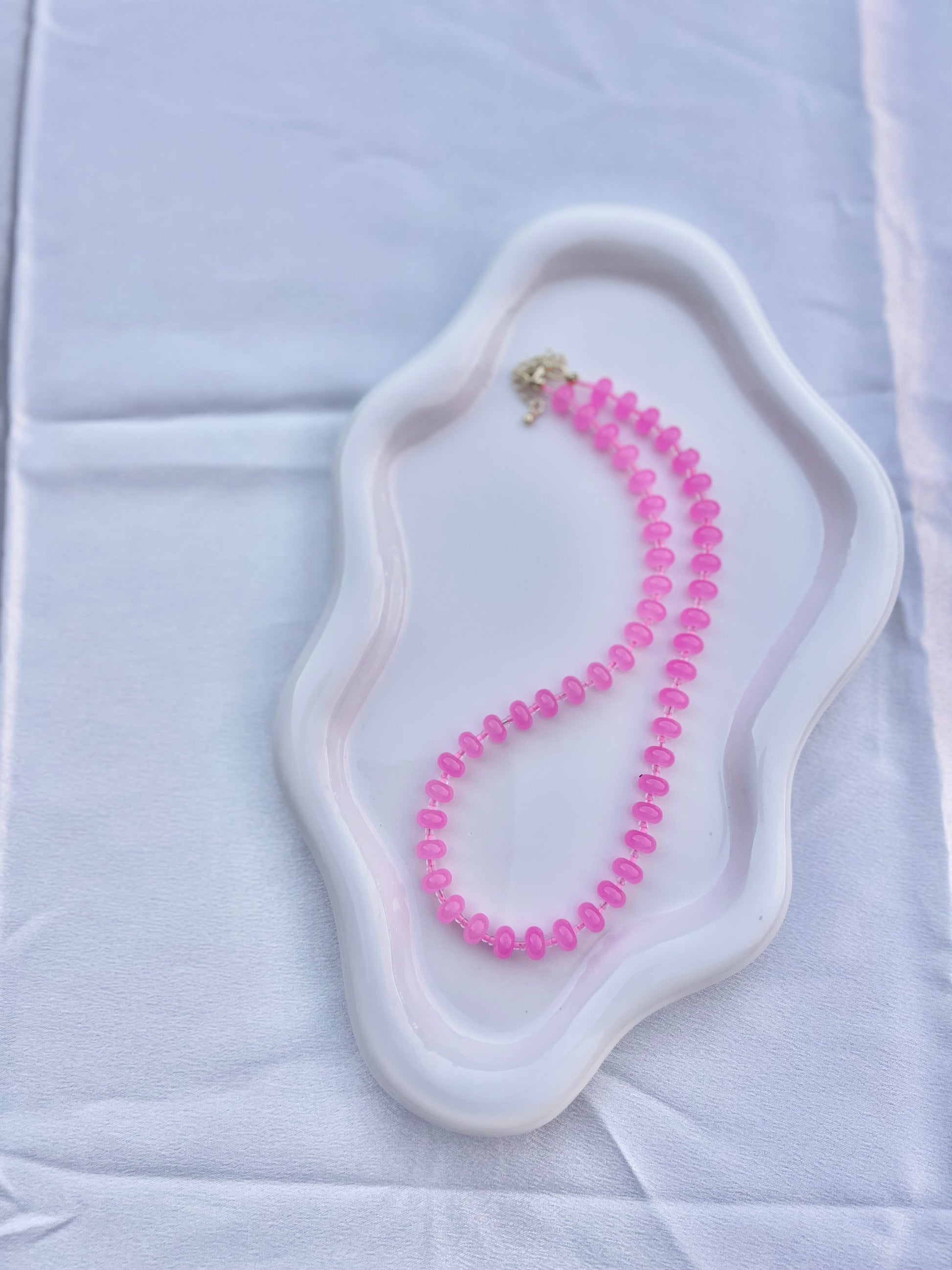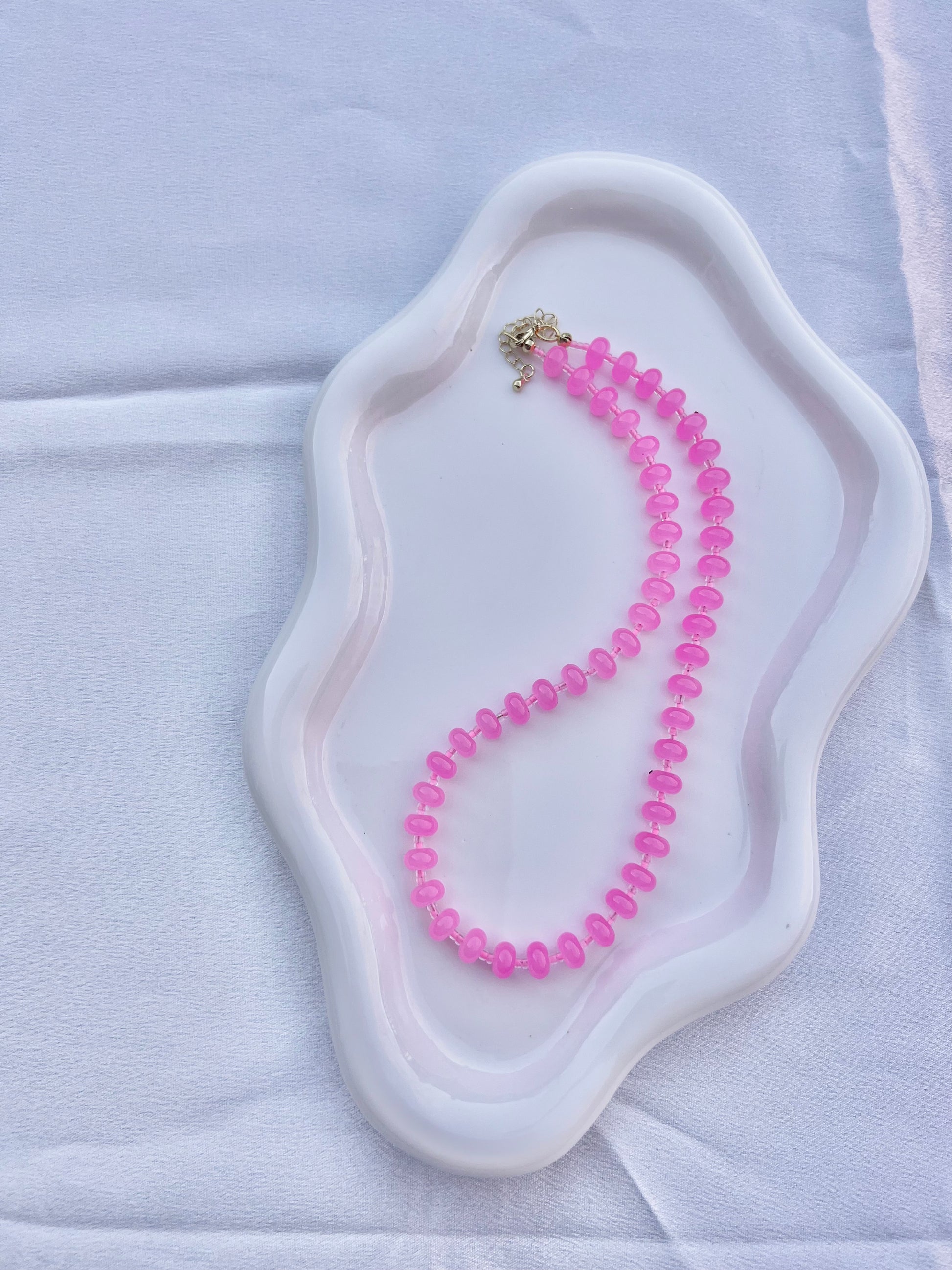 Materials: Punchy Pink Dyed Jade with pink seed beads, gold filled lobster clasp and extender chain.