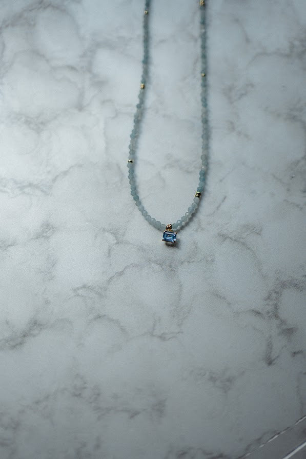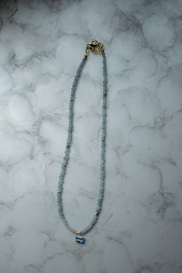 Materials: Blue Topaz gemstone with gold filled blue topaz charm, gold filled spacers, gold filled lobster clasp and gold filled extender chain.