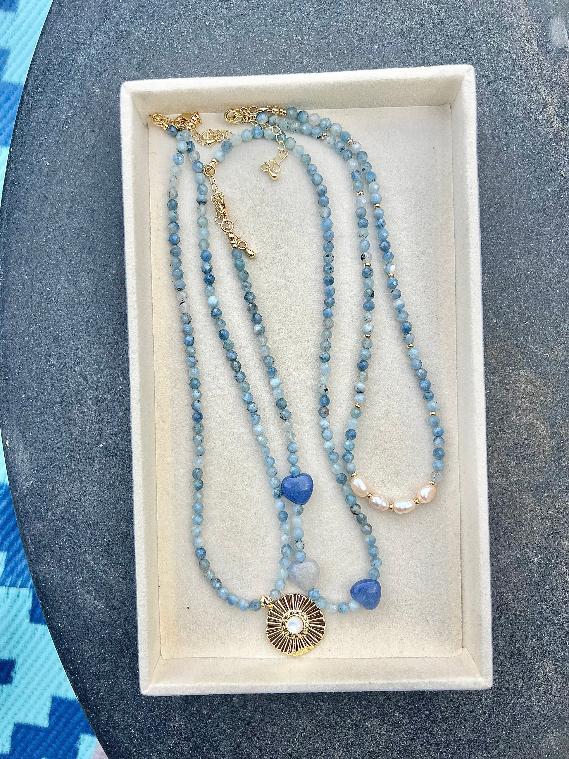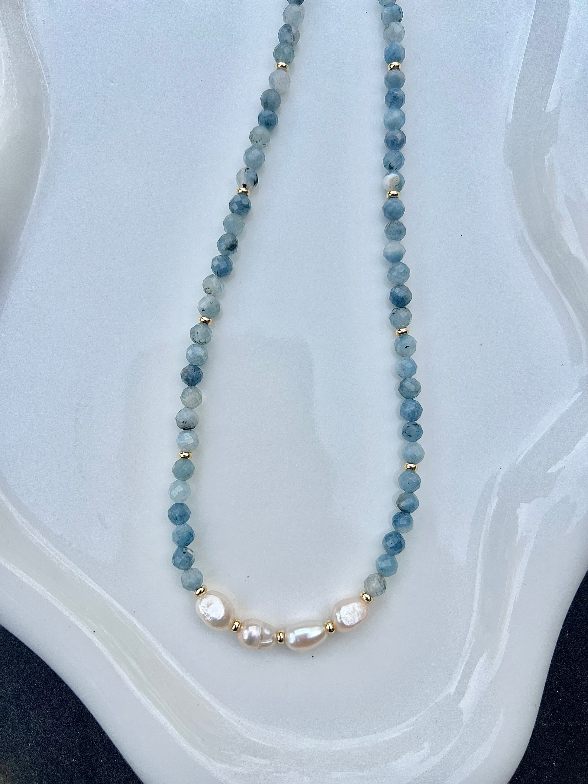 Materials: Aquamarine gemstonse with choice of pearls, heart stones or gold filled moonstone charm, gold filled spacers, gold filled lobster clasp and gold filled extender chain.