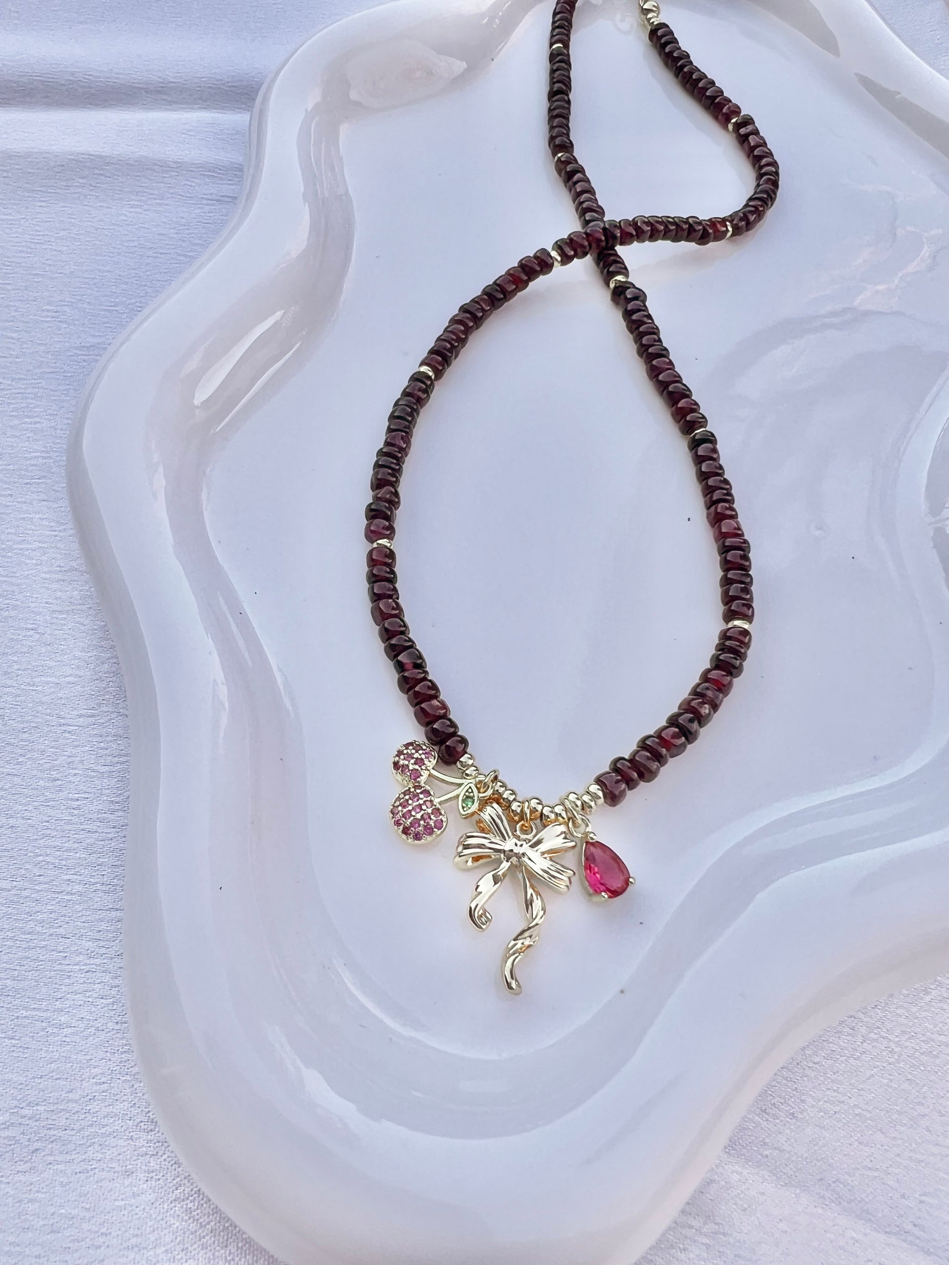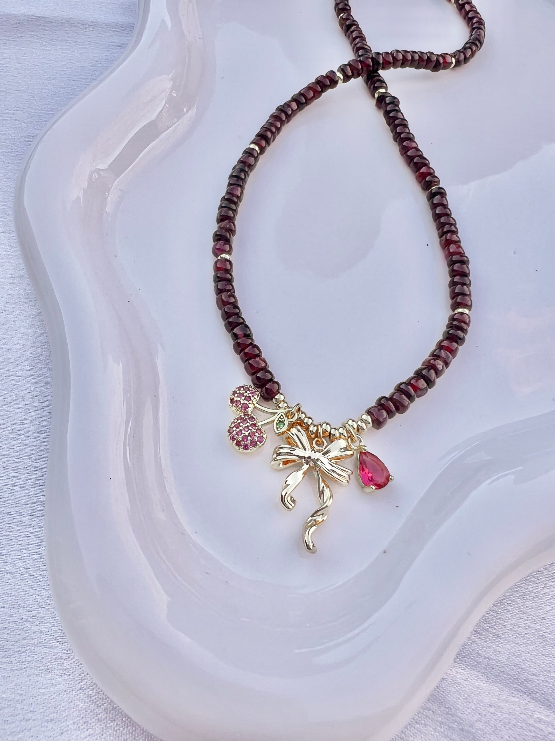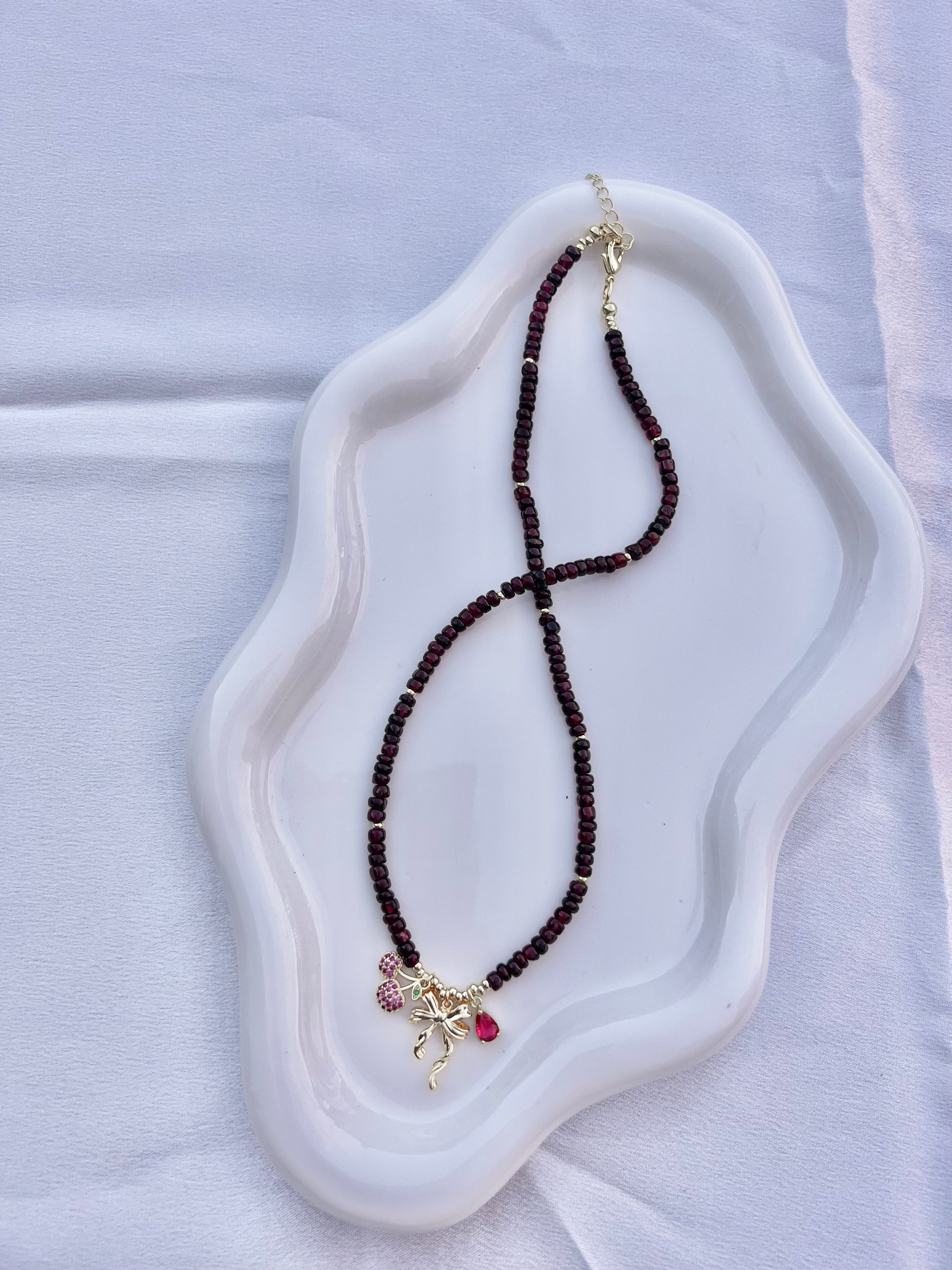 Materials: Garnet Gemstones with three gold filled charms, gold filled lobster clasp and extender chain.