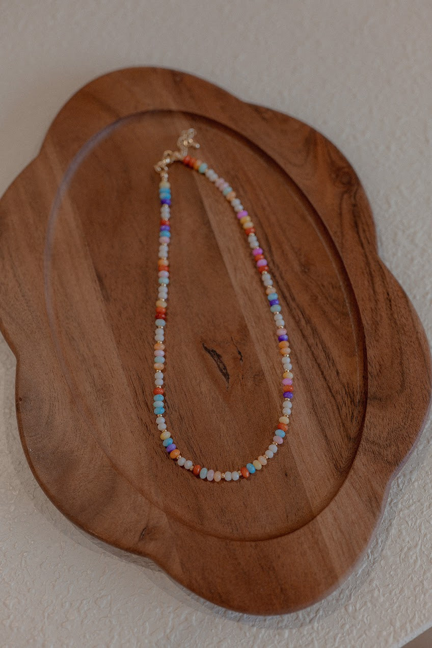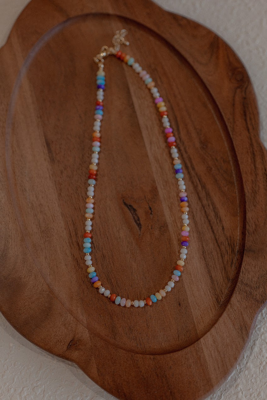 Materials: 5mm Rainbow Mother of Pearl Beads, Gold Filled Spacers, Gold Filled Lobster Clasp and Extender Chain.