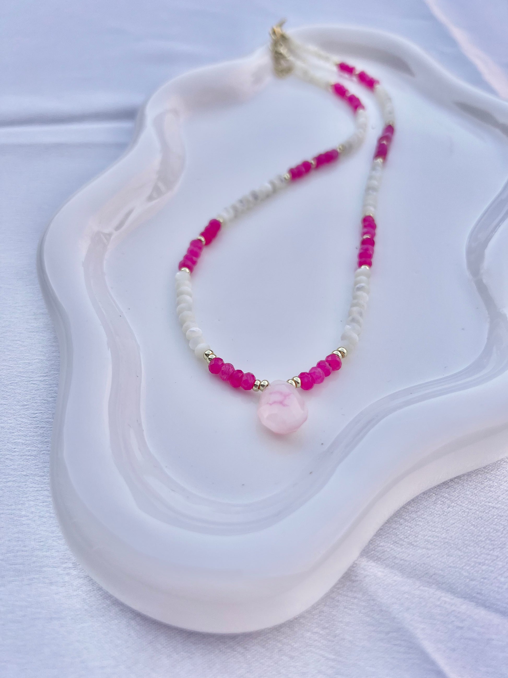 Materials: Mother of Pearl, Pink Dyed Jade, Chalcedony Teardop (exact pattern on stone will vary) with gold filled spacers, gold filled lobster clasp and extender chain.