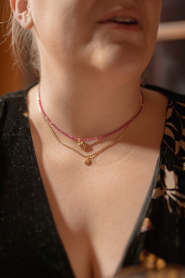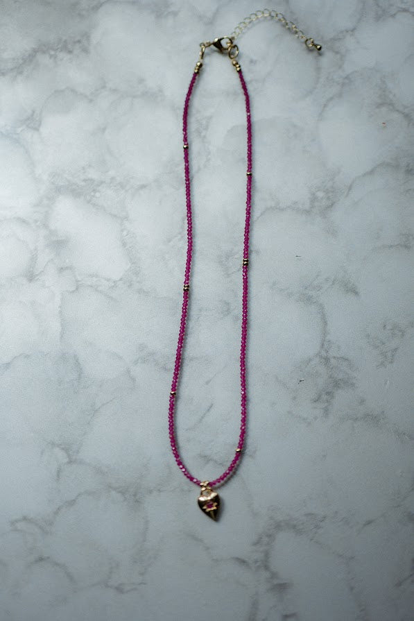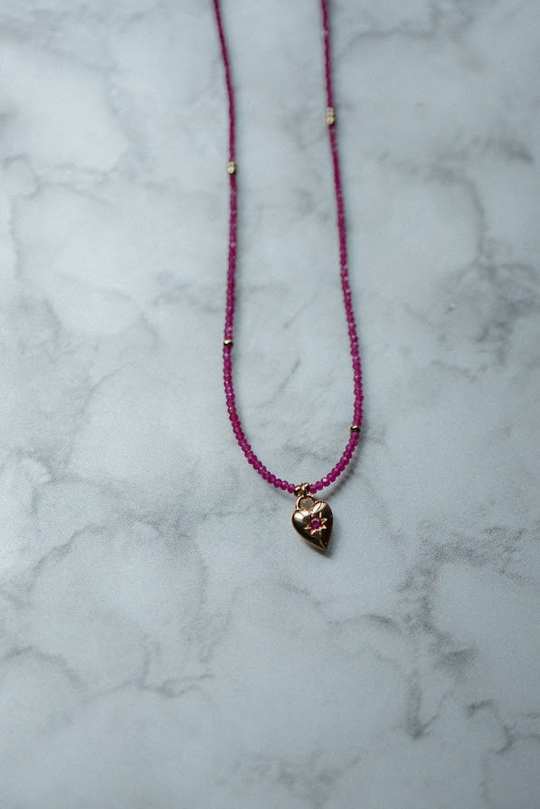 Materials: Ruby gemstone with gold filled heart charm, gold filled spacers, gold filled lobster clasp and gold filled extender chain.