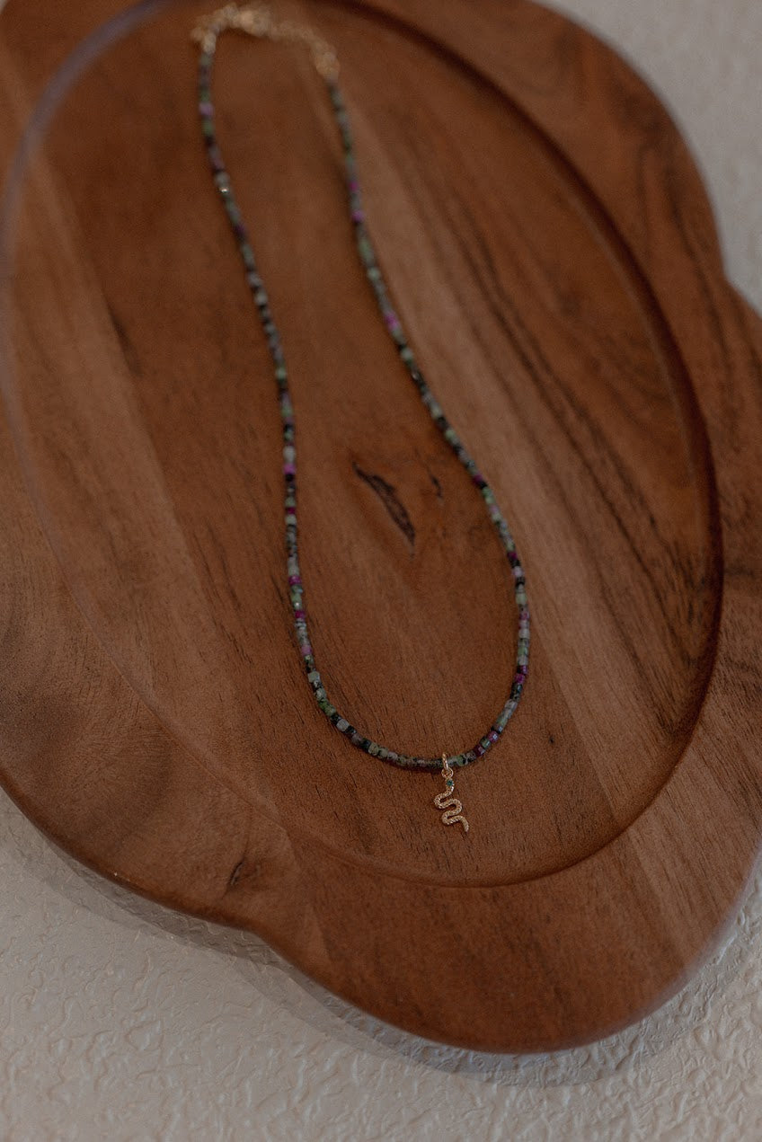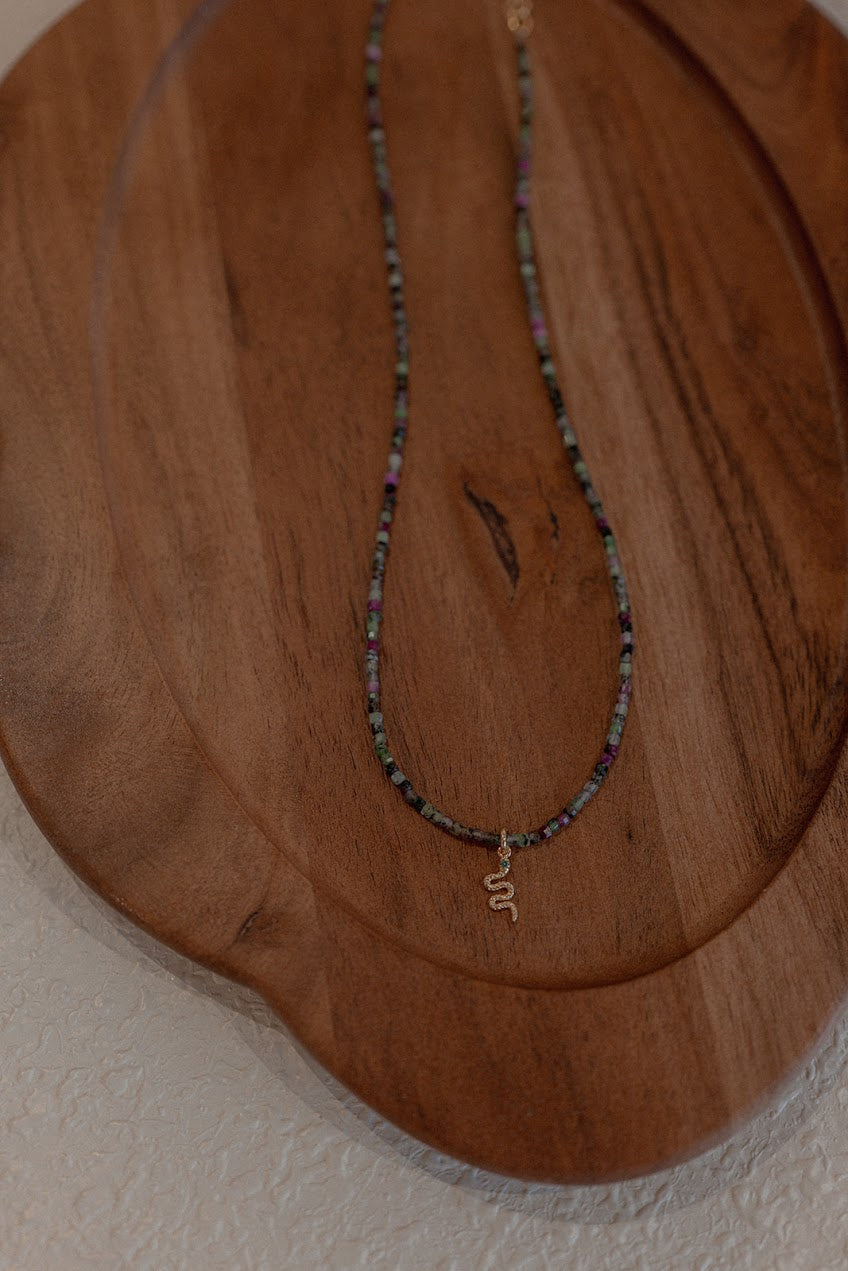 Materials: 2mm Ruby Zoisite, Gold Filled Snake Charm, Gold Filled Lobster Clasp and Gold Filled Extender Chain.