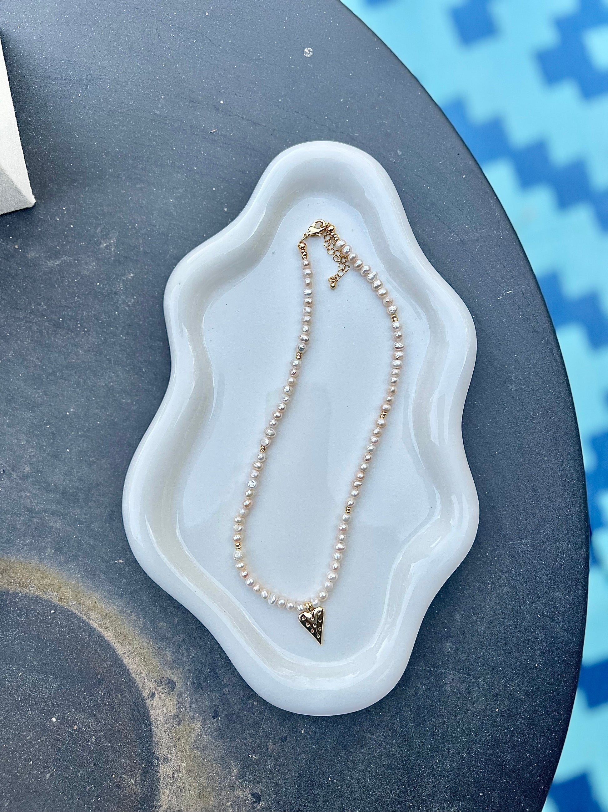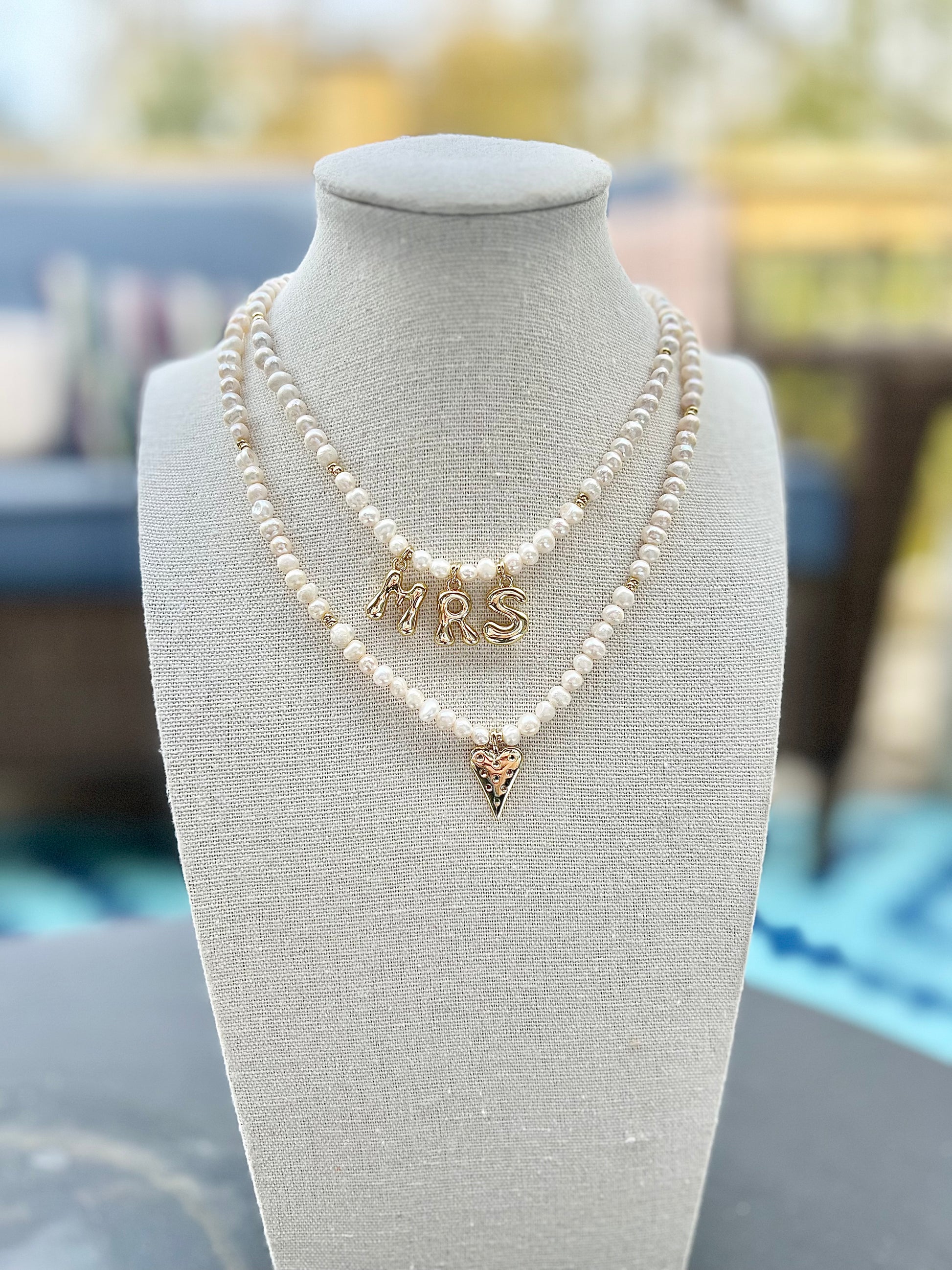 Materials: Freshwater pearls with gold filled heart charm, gold filled spacers, gold filled lobster clasp and gold filled extender chain.