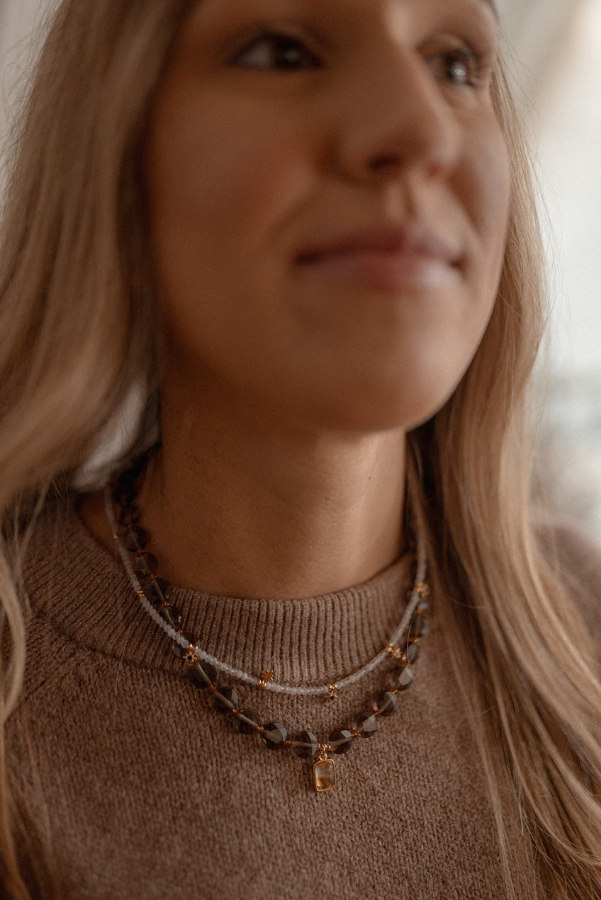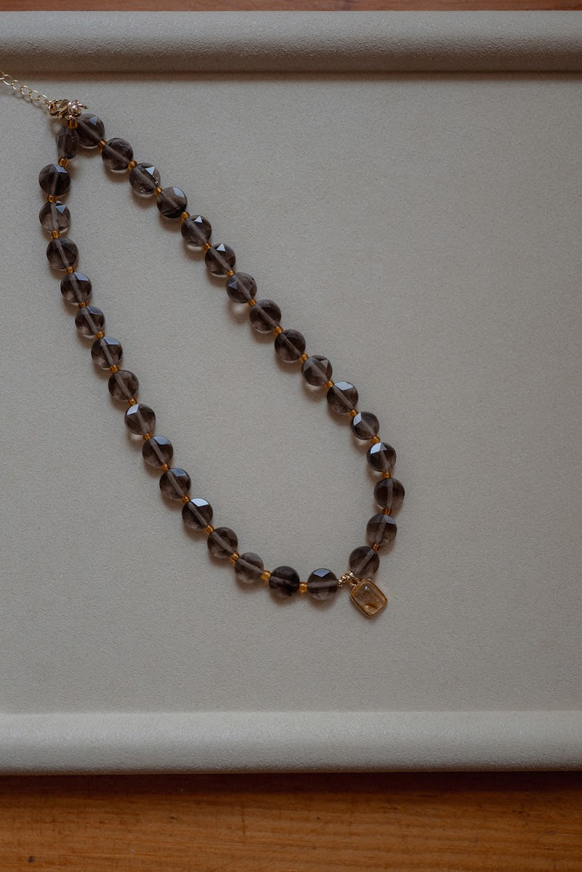 Materials: Natural Ice Obsidian Faceted Gemstones with gold filled citrine charm, gold filled lobster clasp and extender chain.