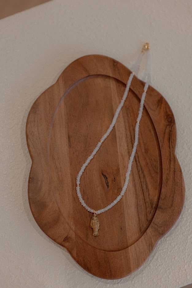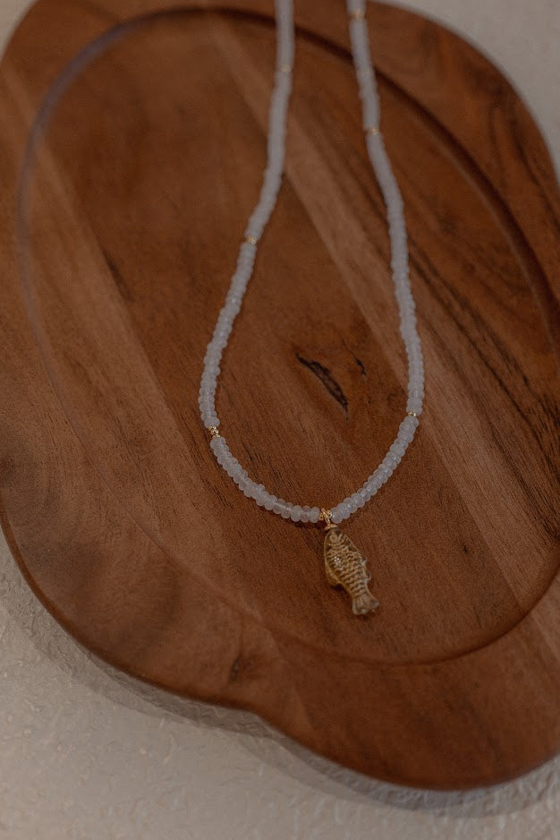 Materials: 4mm White Quartz Rondelle, Gold Filled Spacer, Fish Drop Charm, Gold Filled Lobster Clasp and Extender Chain.
