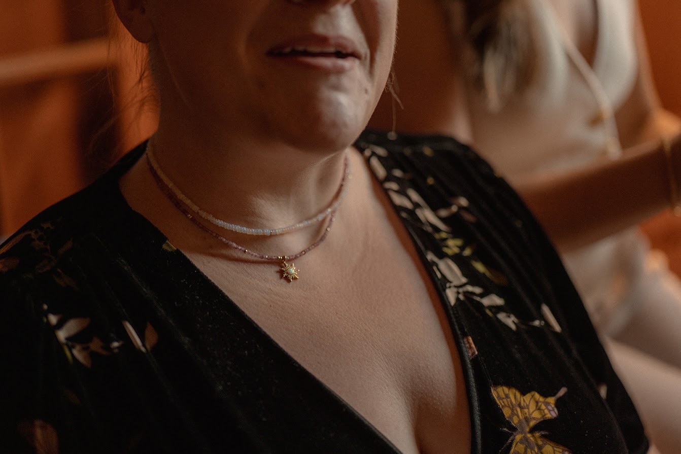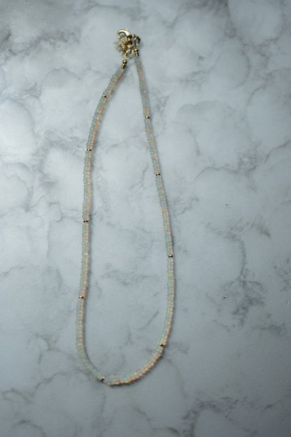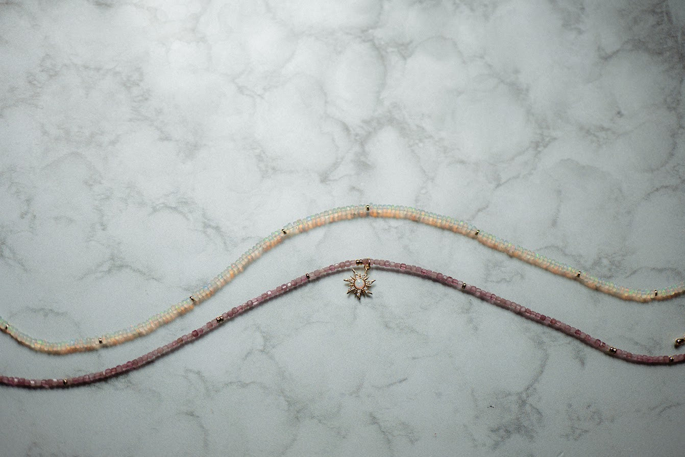 Materials: Two variations of opal gemstones or pink tourmaline gemstones with gold filled pendant charm, gold filled spacers, gold filled lobster clasp and gold filled extender chain.