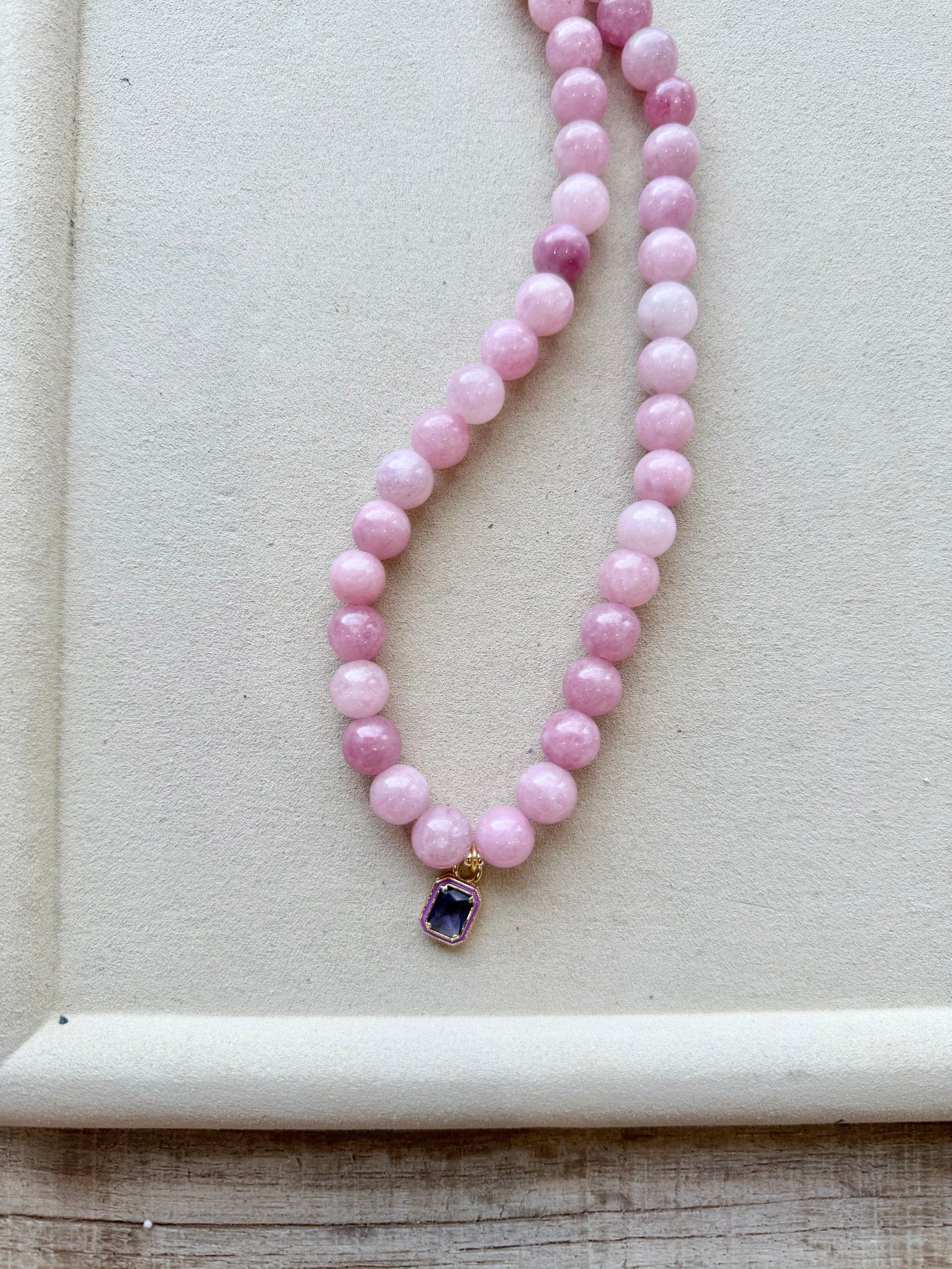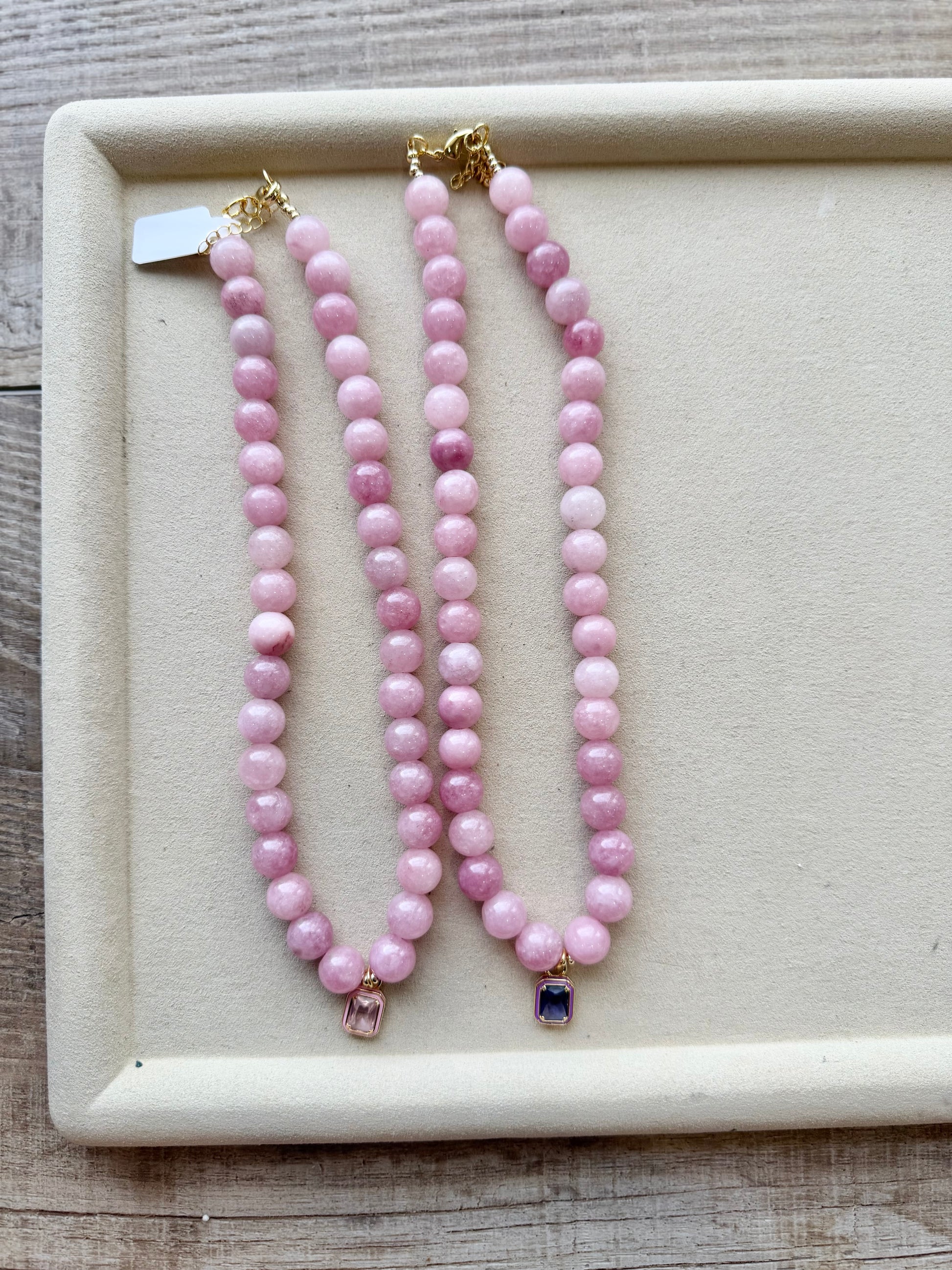 Materials: Dyed Jade 10mm Gemstones, Gold Filled Lobster Clasp with Enamel Bezel Charm in two Color Options.