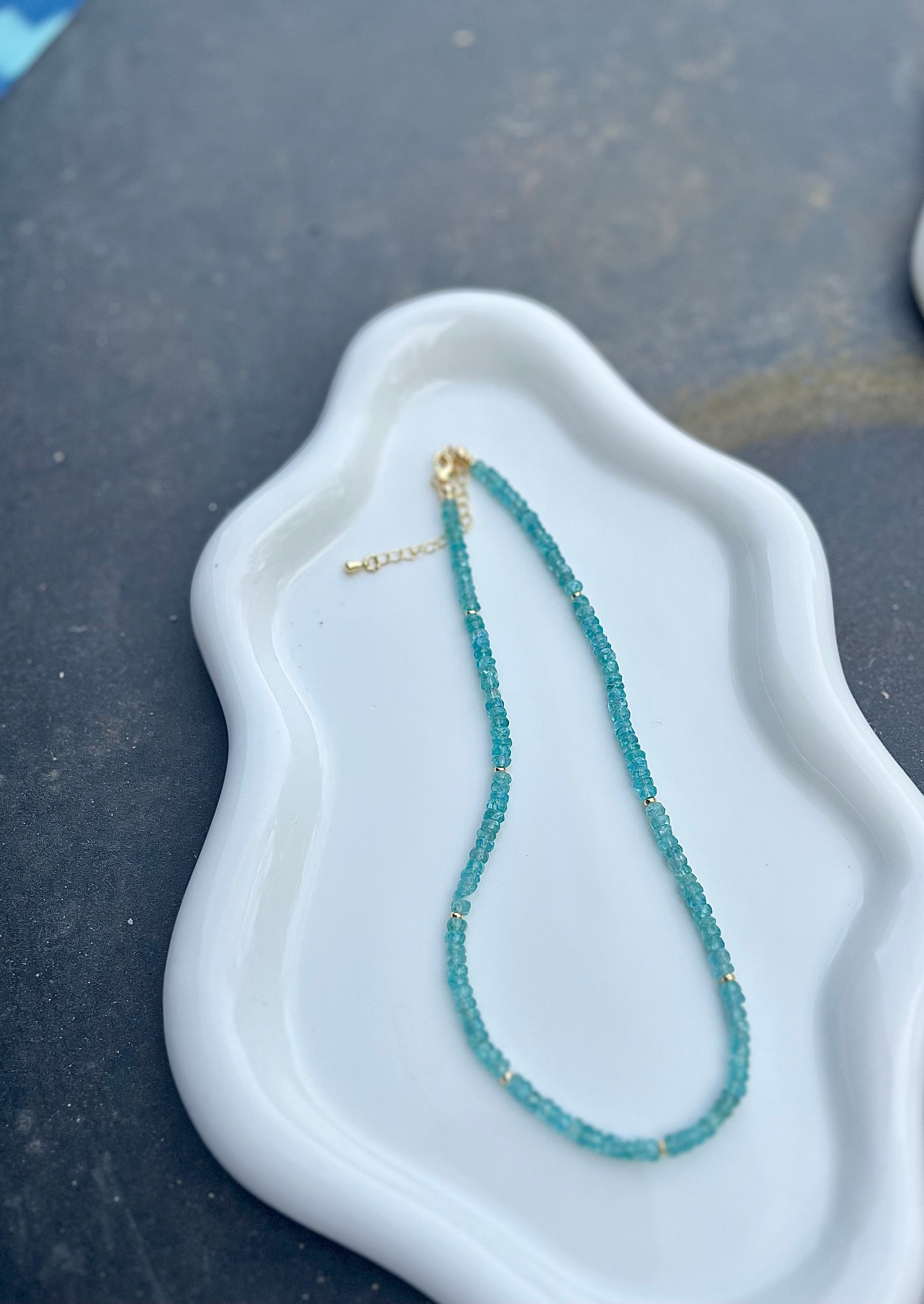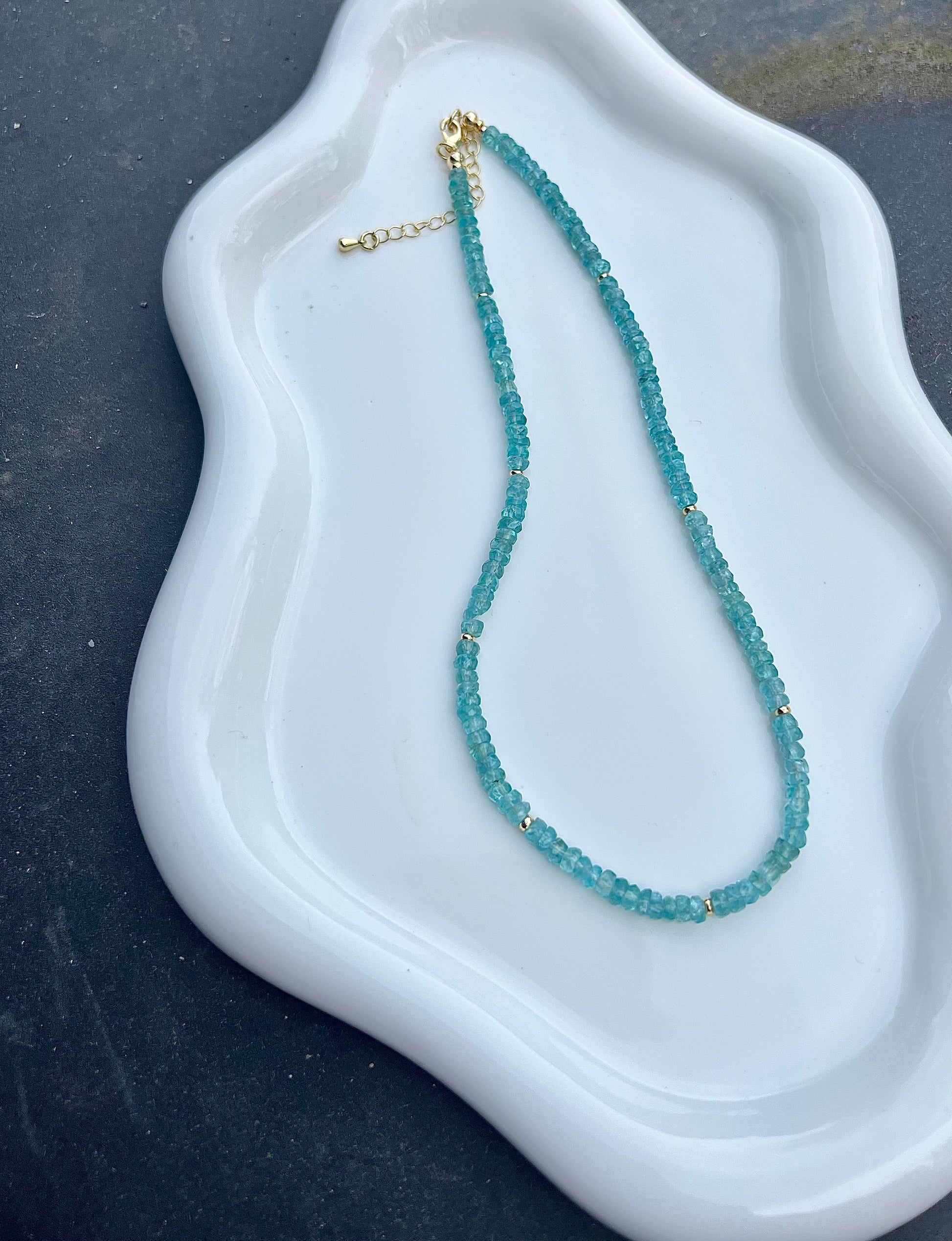 Materials: Blue Apatite gemstone with gold filled spacers, gold filled lobster clasp and gold filled extender chain.