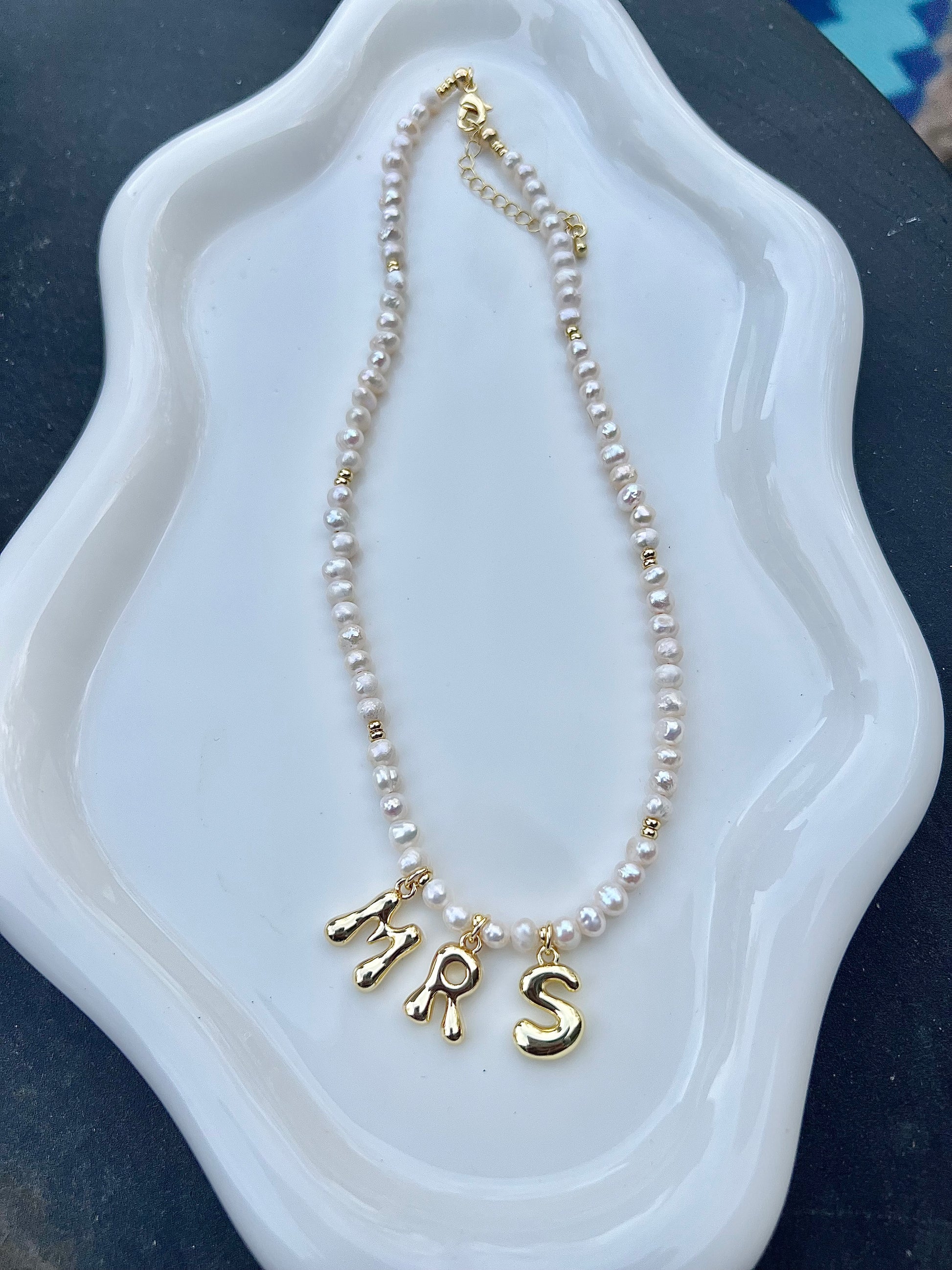 Materials: Freshwater Pearls with gold filled MRS Charms, gold filled spacers, gold filled lobster clasp and gold filled extender chain.