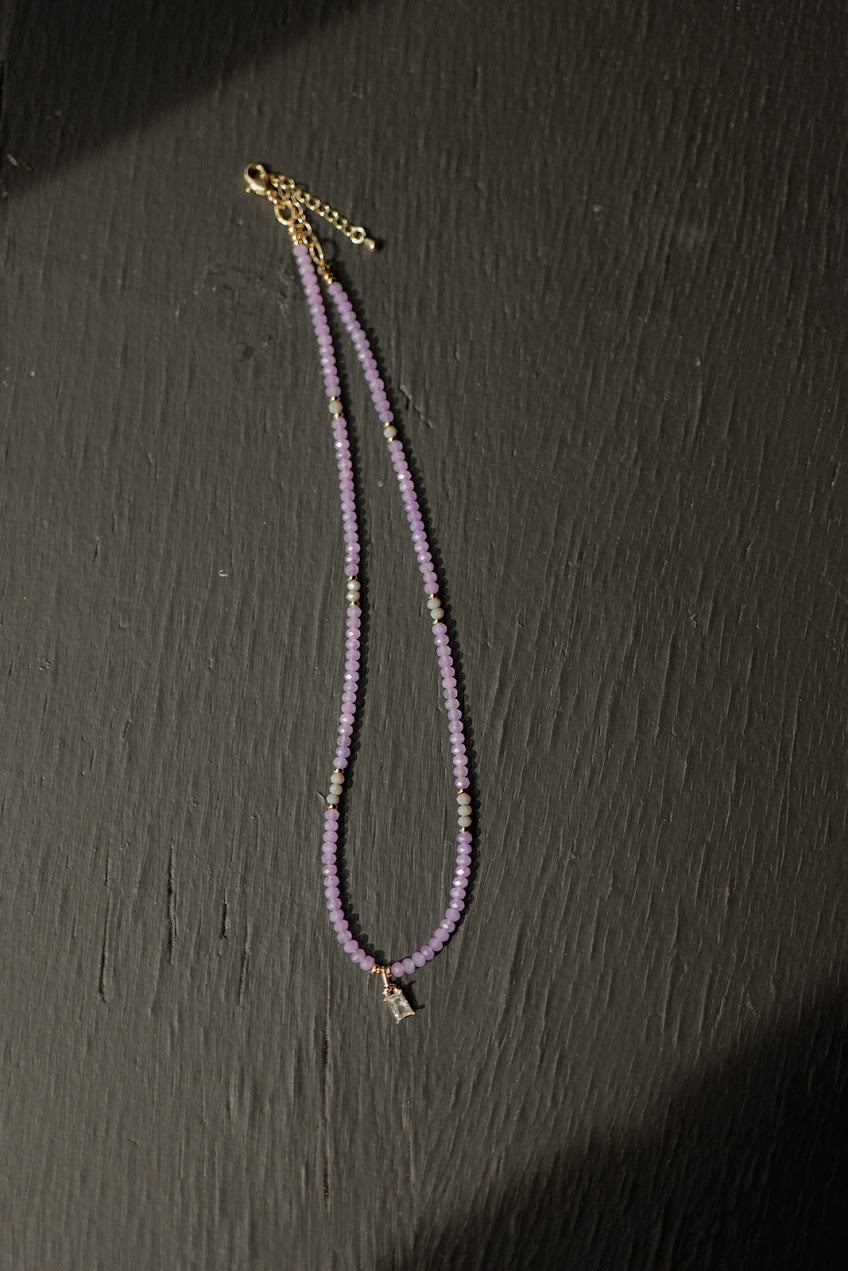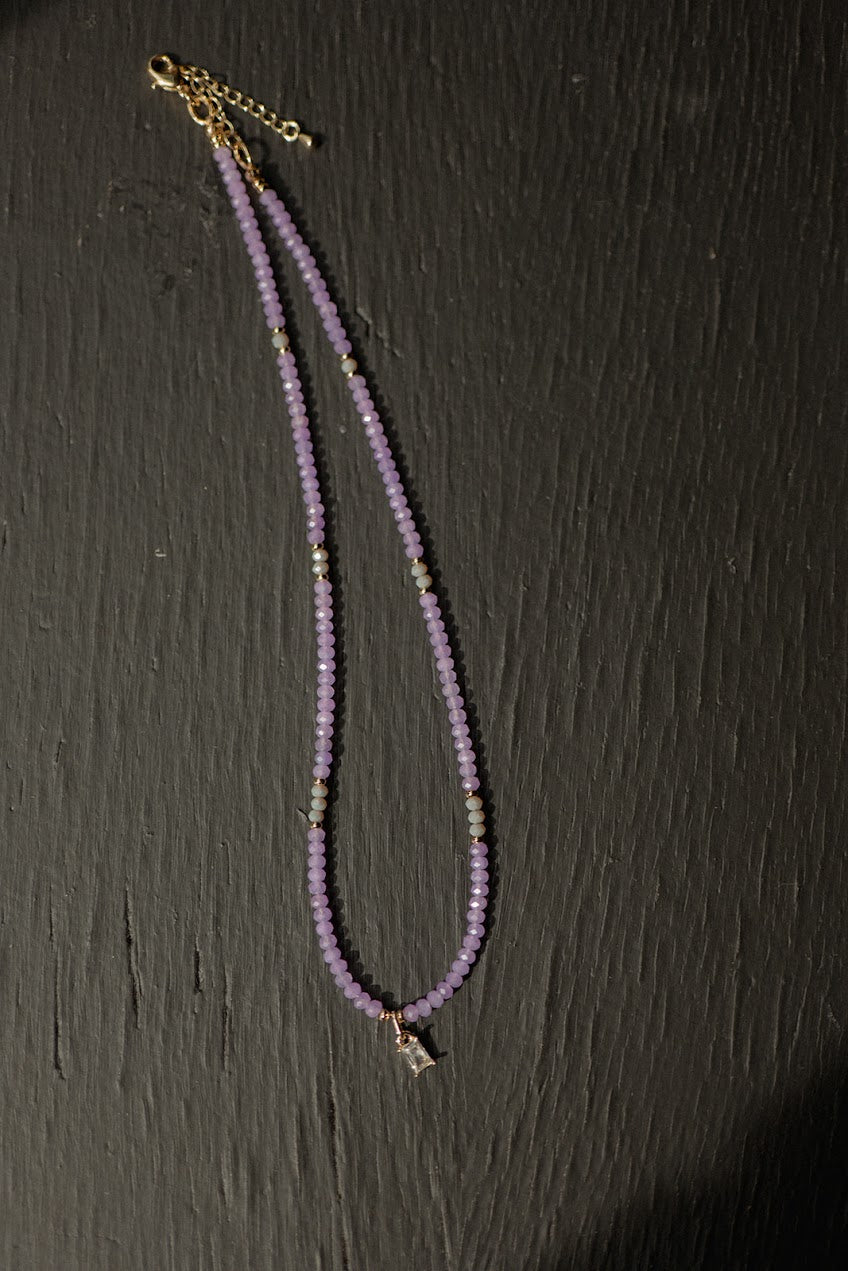 Materials: Lavender Crystal Beads with gold filled spacers, gold filled charm, gold filled lobster clasp and gold filled extender chain.