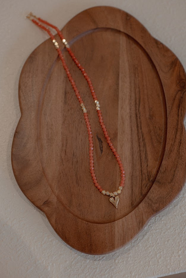 Materials: 4mm Strawberry Sorbet Faceted Crystal Rounds, Gold Filled Spacers, Gold Filled Heart Charm, Gold Filled Lobster Clasp and Extender Chain.