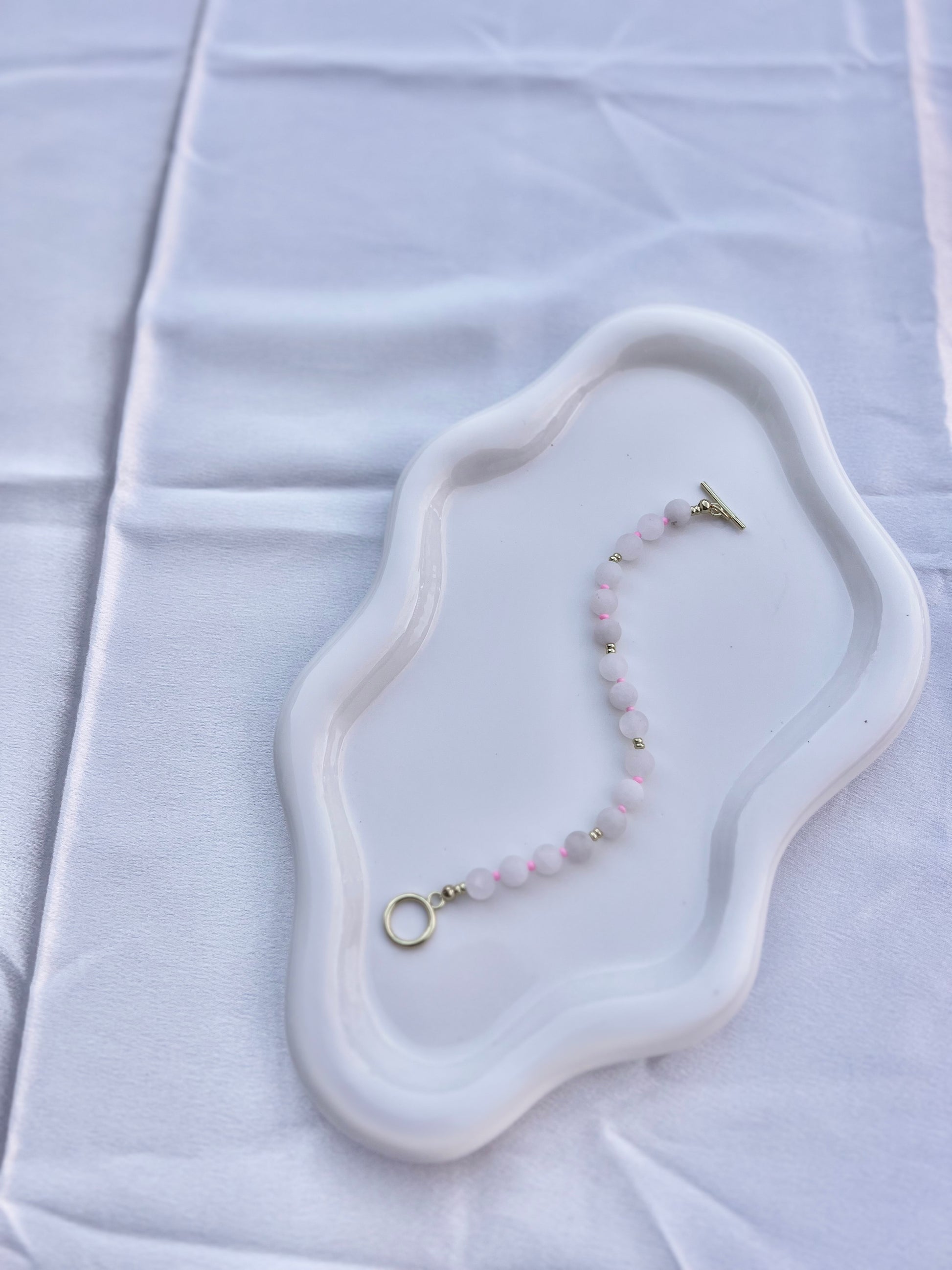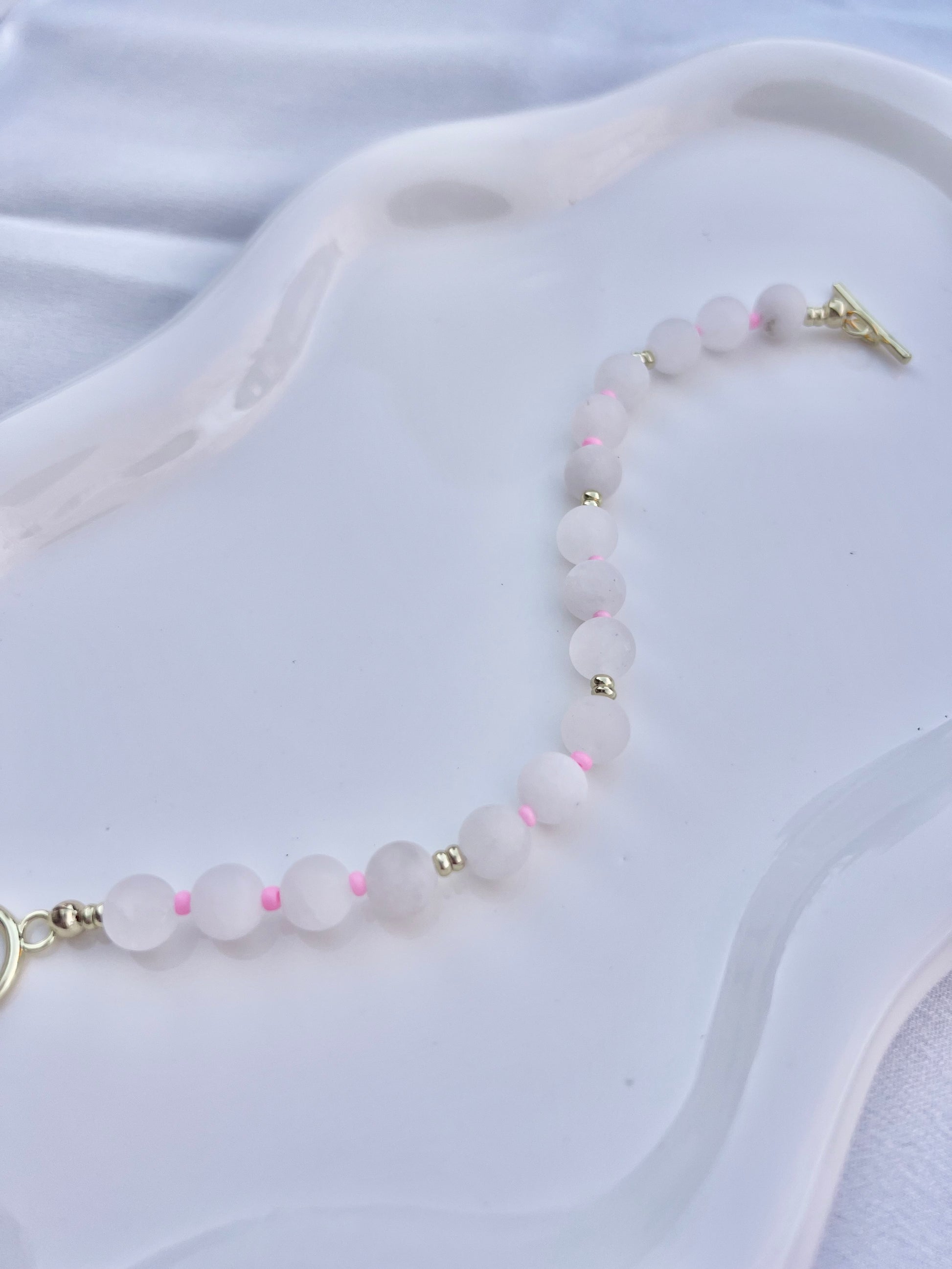 Materials: White Dyed Jade with gold filled spacers, pink seed beads and gold filled toggle.